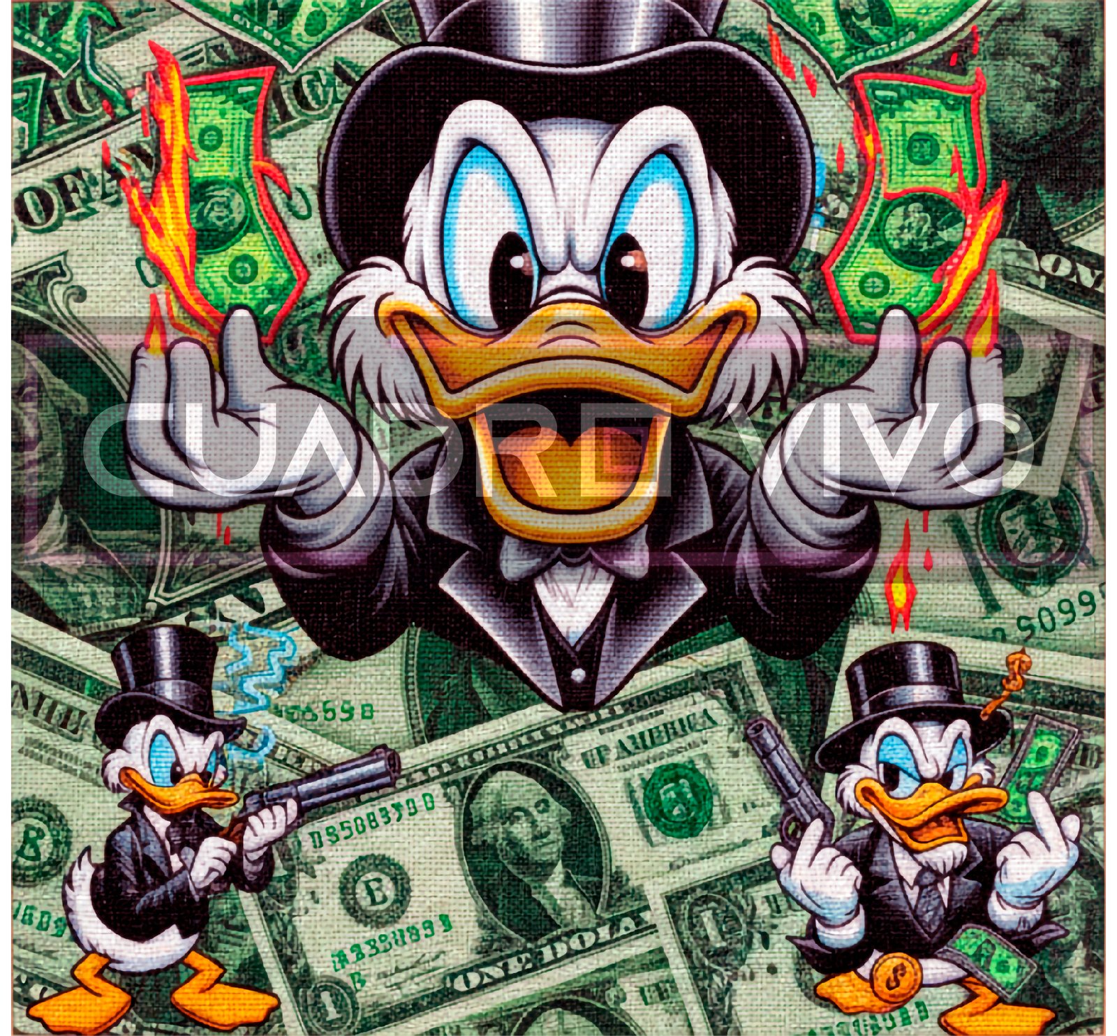 Con colores vibrantes, estética pop-art y detalles potentes, la ilustración del pato quemando billetes transmite fuerza, irreverencia y abundancia.