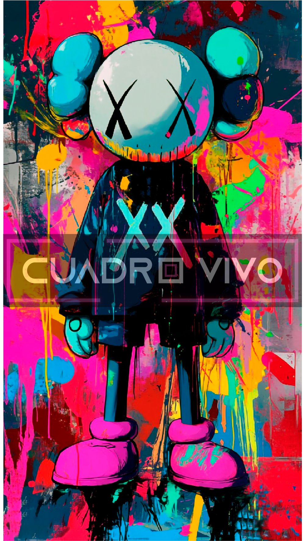 Esta reinterpretación de estilo KAWS combina colores neón, pinceladas agresivas y una estética pop-urbana que domina cualquier estancia. Cada trazo parece vibrar; cada gota de pintura aporta movimiento y personalidad.