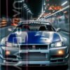 Este cuadro muestra un Nissan Skyline R34, una auténtica leyenda del JDM, avanzando entre luces azules y neones urbanos que iluminan la escena con un brillo cinematográfico.