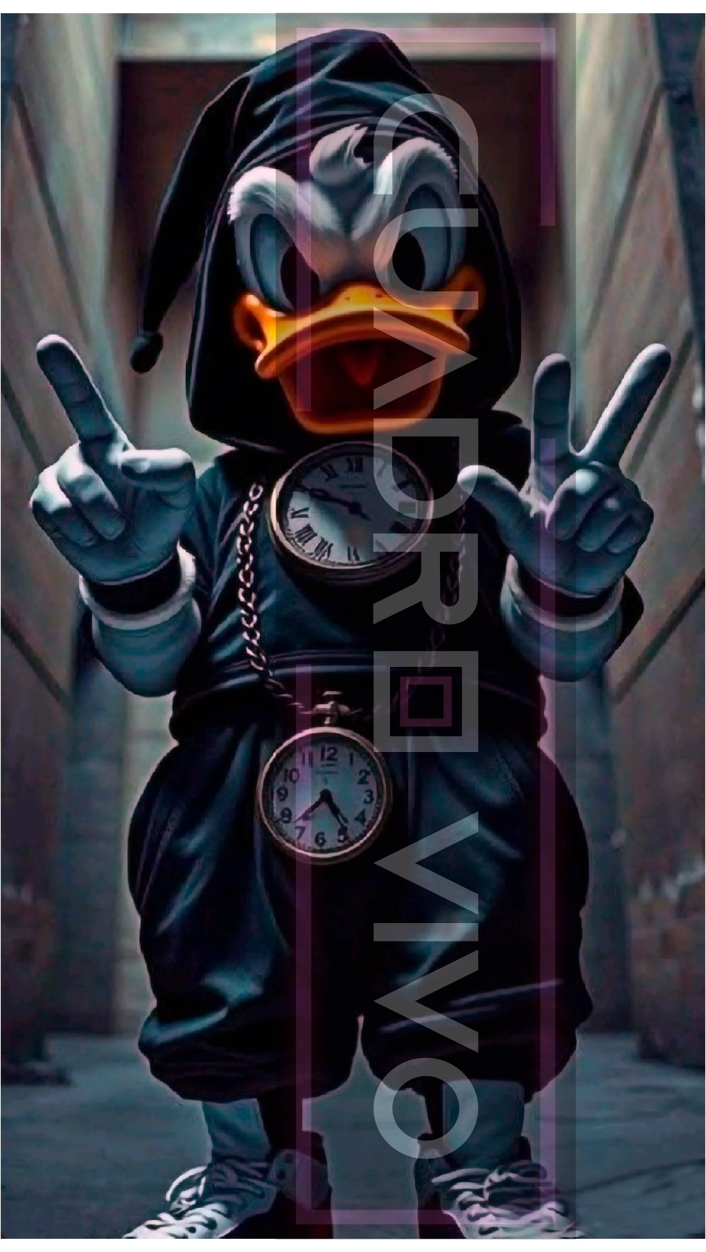 Un pato en modo streetwear, con capucha, cadenas y relojes XXL, simboliza el control del tiempo, la actitud y la libertad de hacer las cosas a tu manera.