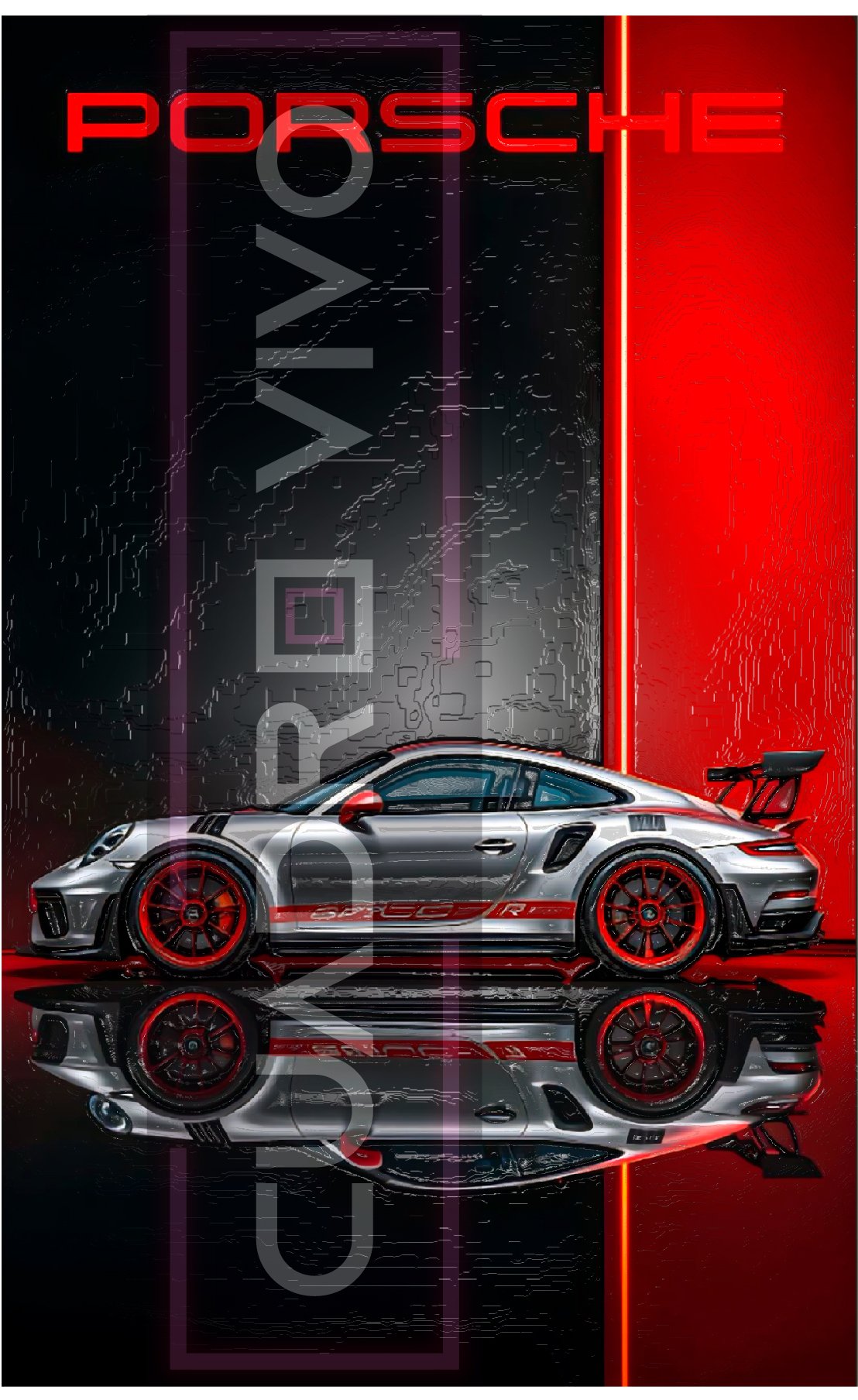 Este cuadro muestra un Porsche de alto rendimiento con un acabado impecable, reflejado sobre una superficie pulida y acompañado por un fondo dividido entre rojo intenso y negro profundo. La composición transmite potencia, precisión y elegancia deportiva, capturando la esencia de la ingeniería alemana.