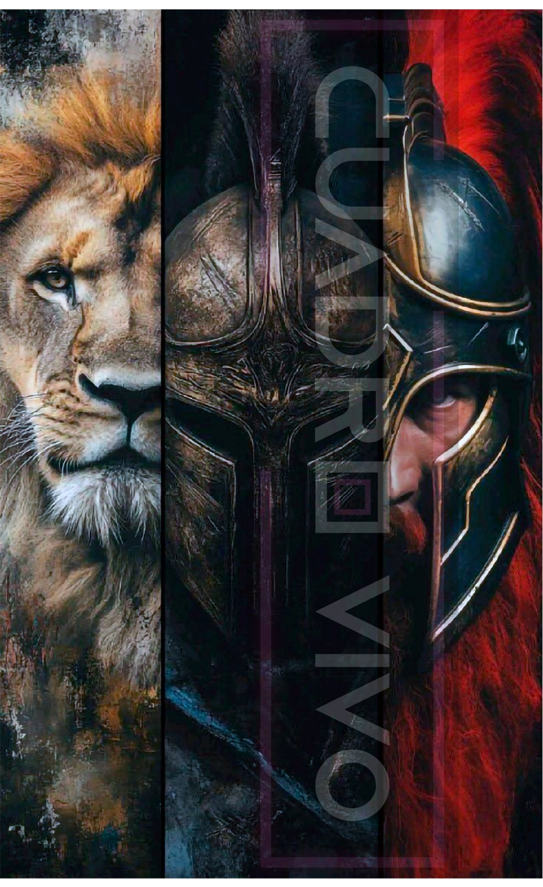 Potencia pura para tu pared: un león imparable y un guerrero legendario unidos en una sola obra que transmite fuerza, enfoque y protección. Ideal para quienes viven con propósito y espíritu indomable.